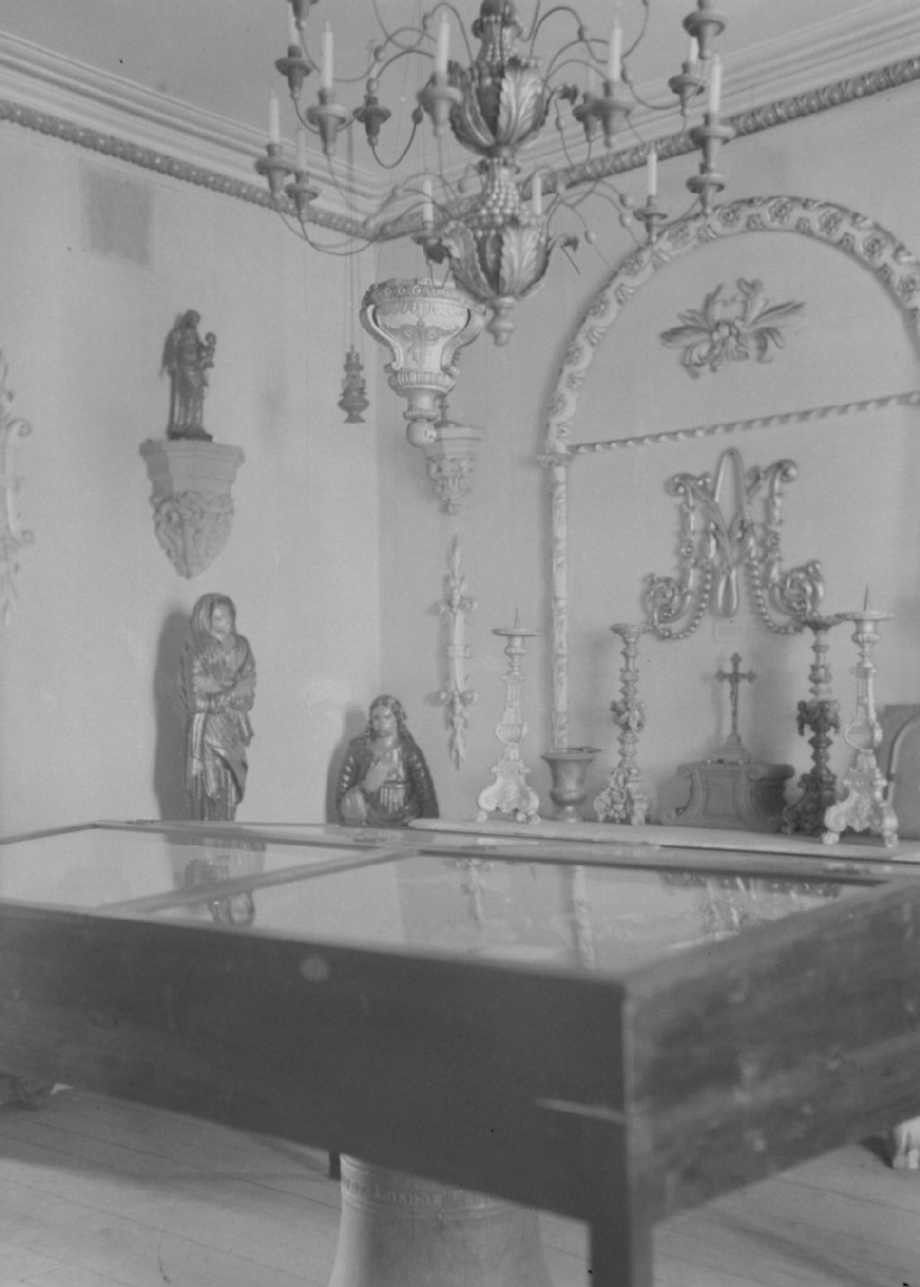 Montréal, Île de Montréal - Château Ramezay - Salle de la sculpture et monogramme en bois d'Alexis Milette, [Vers 1950], Archives nationales à Québec, Fonds ministère de la Culture et des Communications, (03Q,E6,S8,SS1,SSS566,D2329), Photographe non identifié.