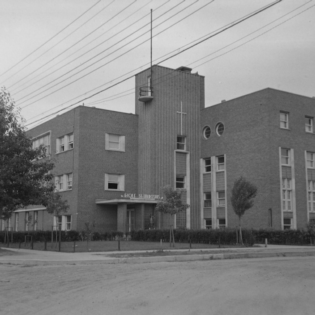 Dolbeau, Lac-Saint-Jean-Ouest - Écoles - École Saint-Tharcisuis, 1950, Archives nationales à Québec, Fonds ministère de la Culture et des Communications, (03Q,E6,S8,SS1,SSS851,D5232), Omer Parent.