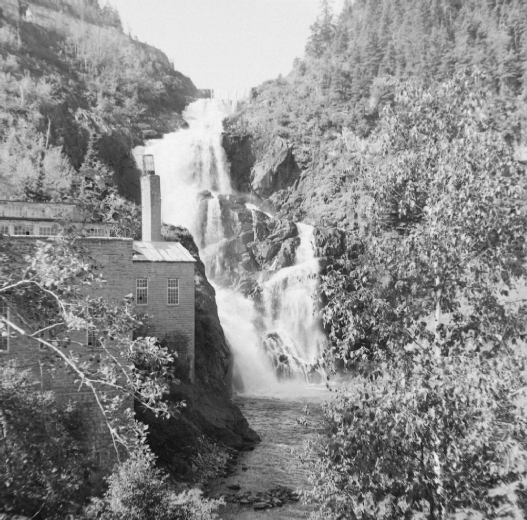 Val-Jalbert, Lac-Saint-Jean-Ouest - Moulin - Extérieur et les environs, 1953, Archives nationales à Québec, Fonds ministère de la Culture et des Communications, (03Q,E6,S8,SS1,SSS863,D5261), Omer Parent.