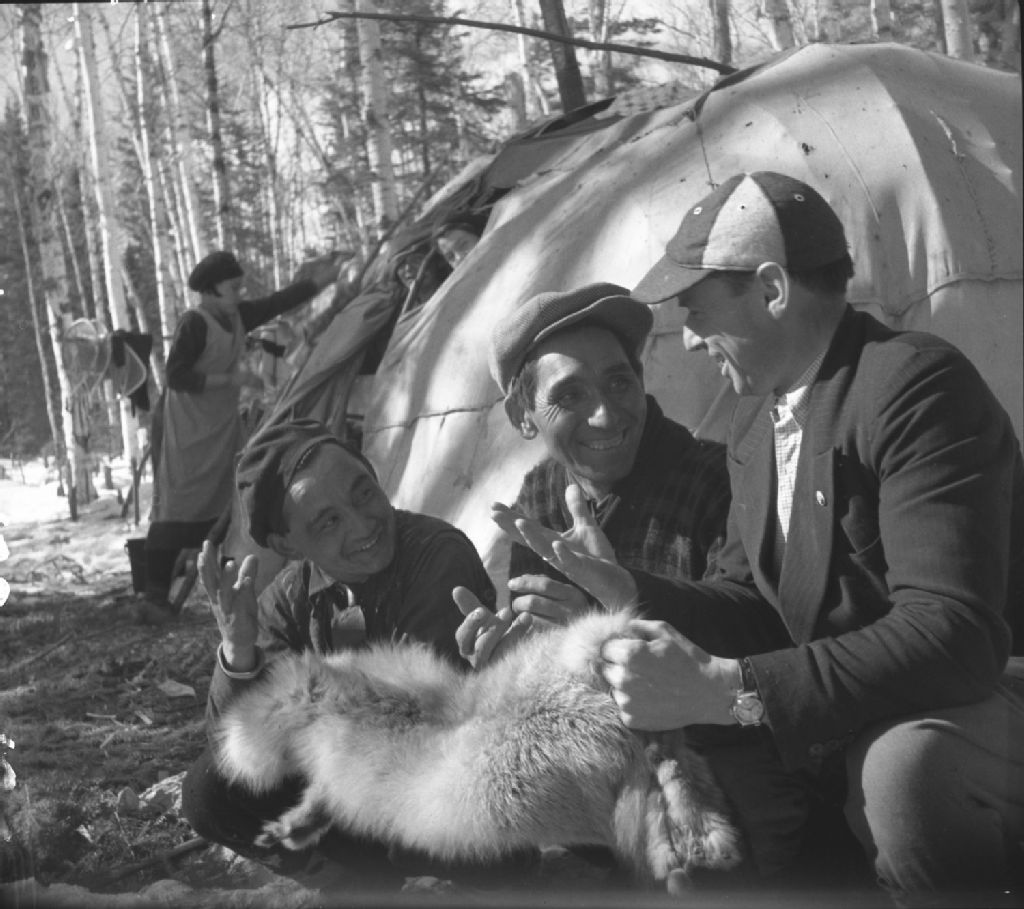Texte tiré des propos de Paul Provencher :Adémar Martin et Jos. Labbé en pourparler de vente d'une peau de renard avec Félix Poitras, trappeur du « Ruisseau vert ». Scène typique montagnaise devant le cabanage rond, rivière Manicouagan (1934). [1939]