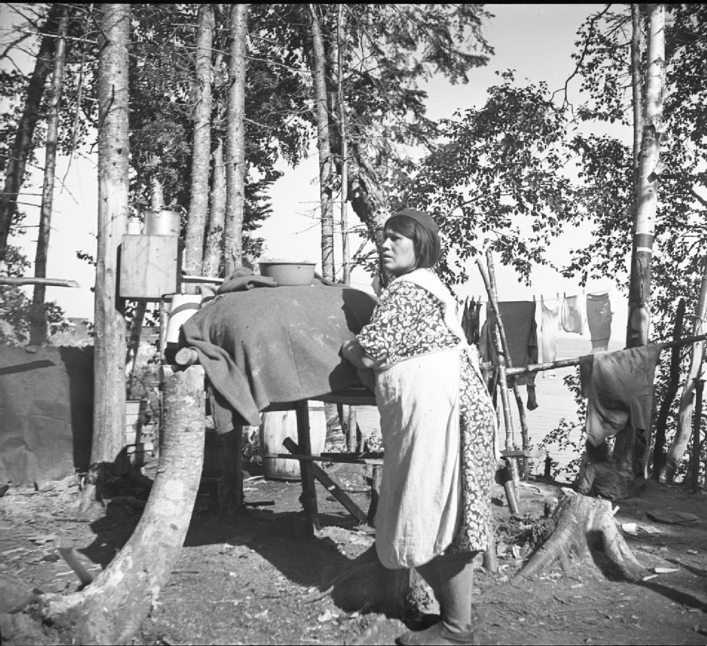Madame Joseph Siméon près de sa cache à provisions, [1942], Archives nationales à Québec, Fonds Ministère de la Culture et des Communications, (03Q,E6,S9,P172A), Paul Provencher.