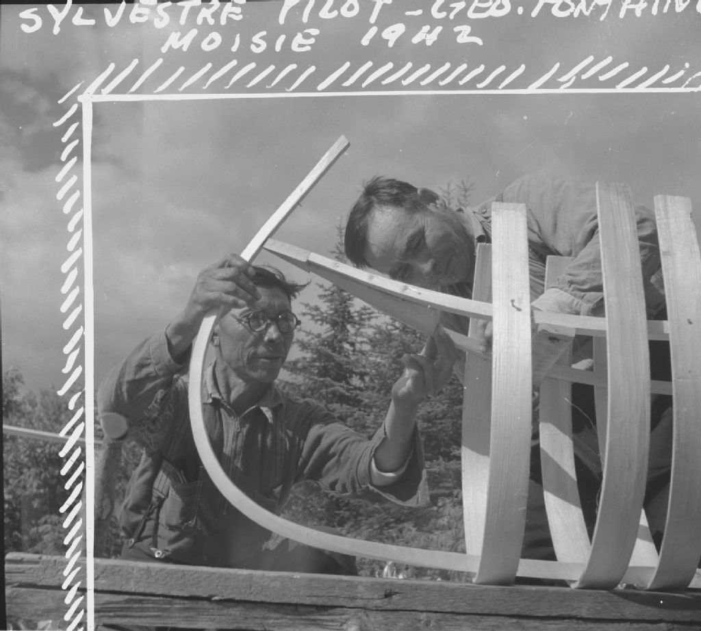Construction d'un canot montagnais à Moisie - Sylvestre Pilot aide George Fontaine, maître-charpentier à tenir la pince, 1942, Archives nationales à Québec, Fonds Ministère de la Culture et des Communications, (03Q,E6,S9,P226), Paul Provencher.
