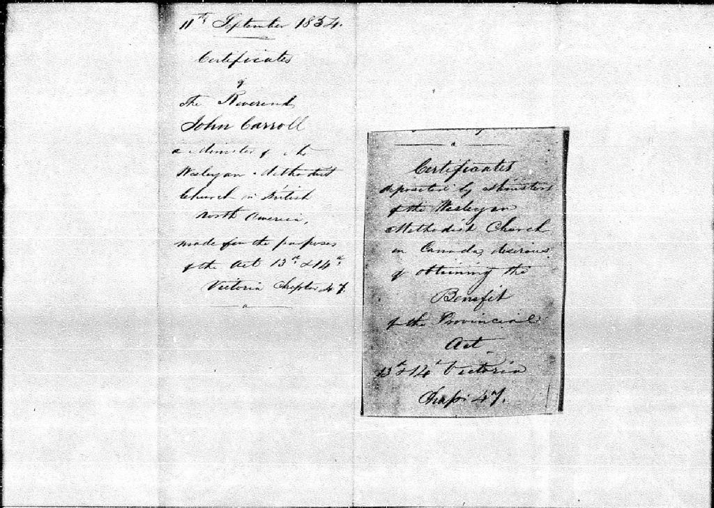 - Certificats d'ordination et de compétence des révérends James Norris, 3 août 1854, James Henry Bishop, 5 août 1854, John Evans, 6 septembre 1854, John Carroll, 11 septembre 1854, Wellington Jeffers, 5 octobre 1854, et Isaac Barber, 10 octobre 1854, tous pasteurs de l'Église méthodiste
