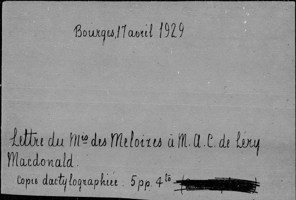 - Lettre de Des Meloizes à son cousin A.-C. De Léry Mcdonald, Bourges, 17 avril 1929