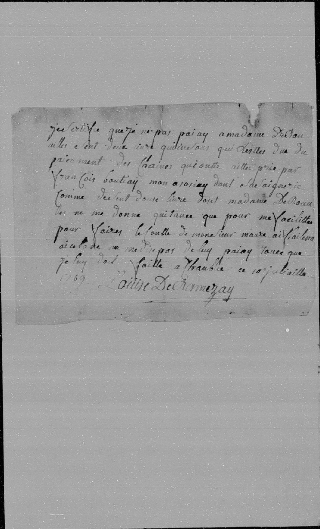 - Extrait des registres du greffe de Montréal sur une sentence prononcée à la demande de monsieur Hertel de Rouville contre Louise Ramezay, 11 août 1761; attestation de dette signée par Louise de Ramezay, 10 juillet 1769