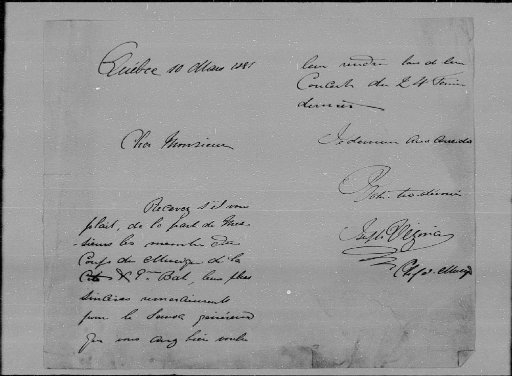 Lettre de Joseph Vézina à un destinataire non identifié, Québec, 10 mars 1881