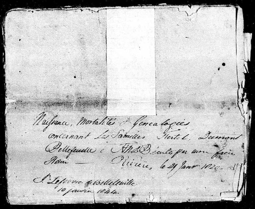- Document contenant la liste des naissances et des décès, de même que la généalogie des familles Hertel, Dumont et Bellefeuille, Trois-Rivières, 1820-1881