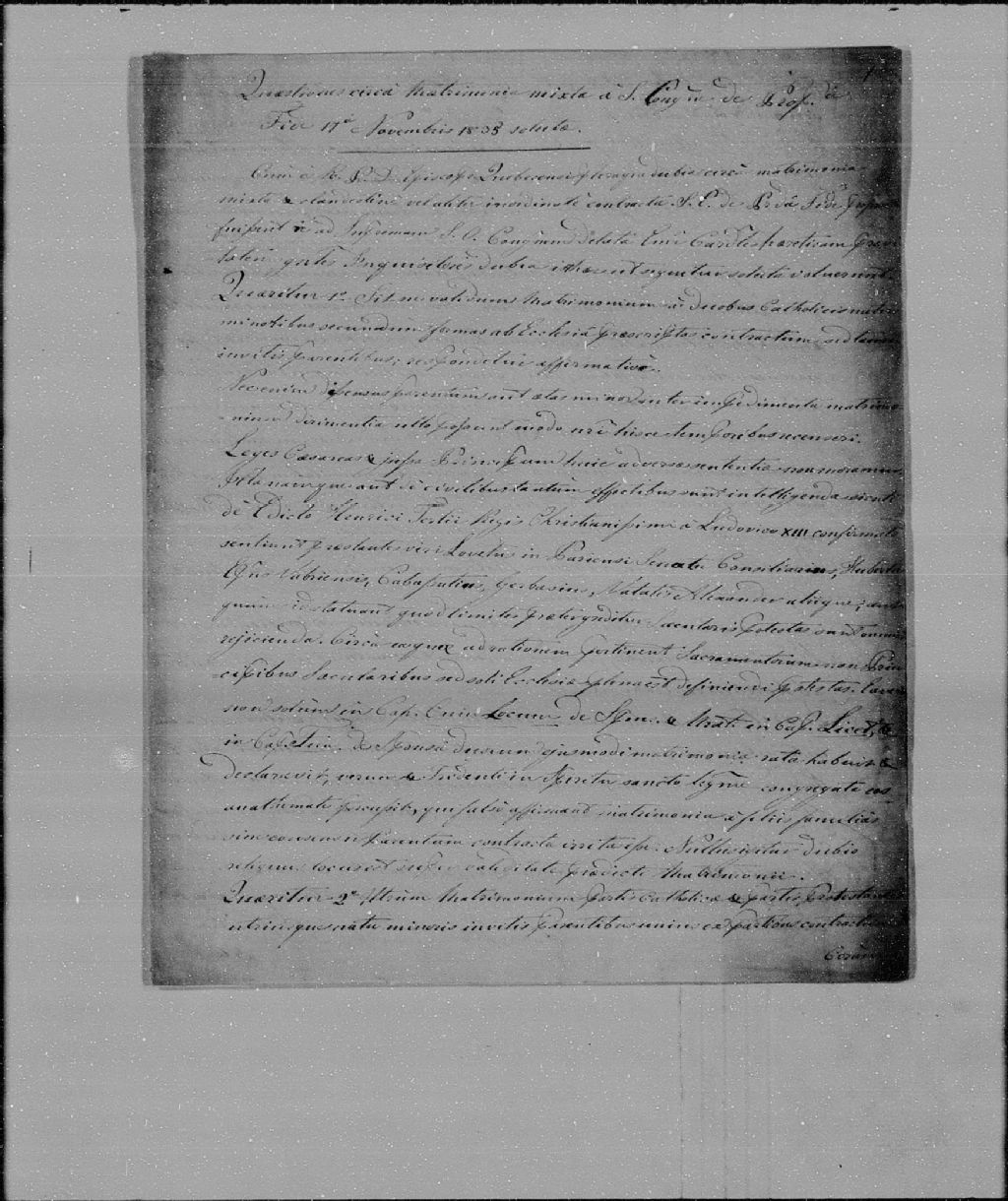 - Manuscrit en latin intitulé: «Questiones circa matrimonia mixta», 17 novembre 1835