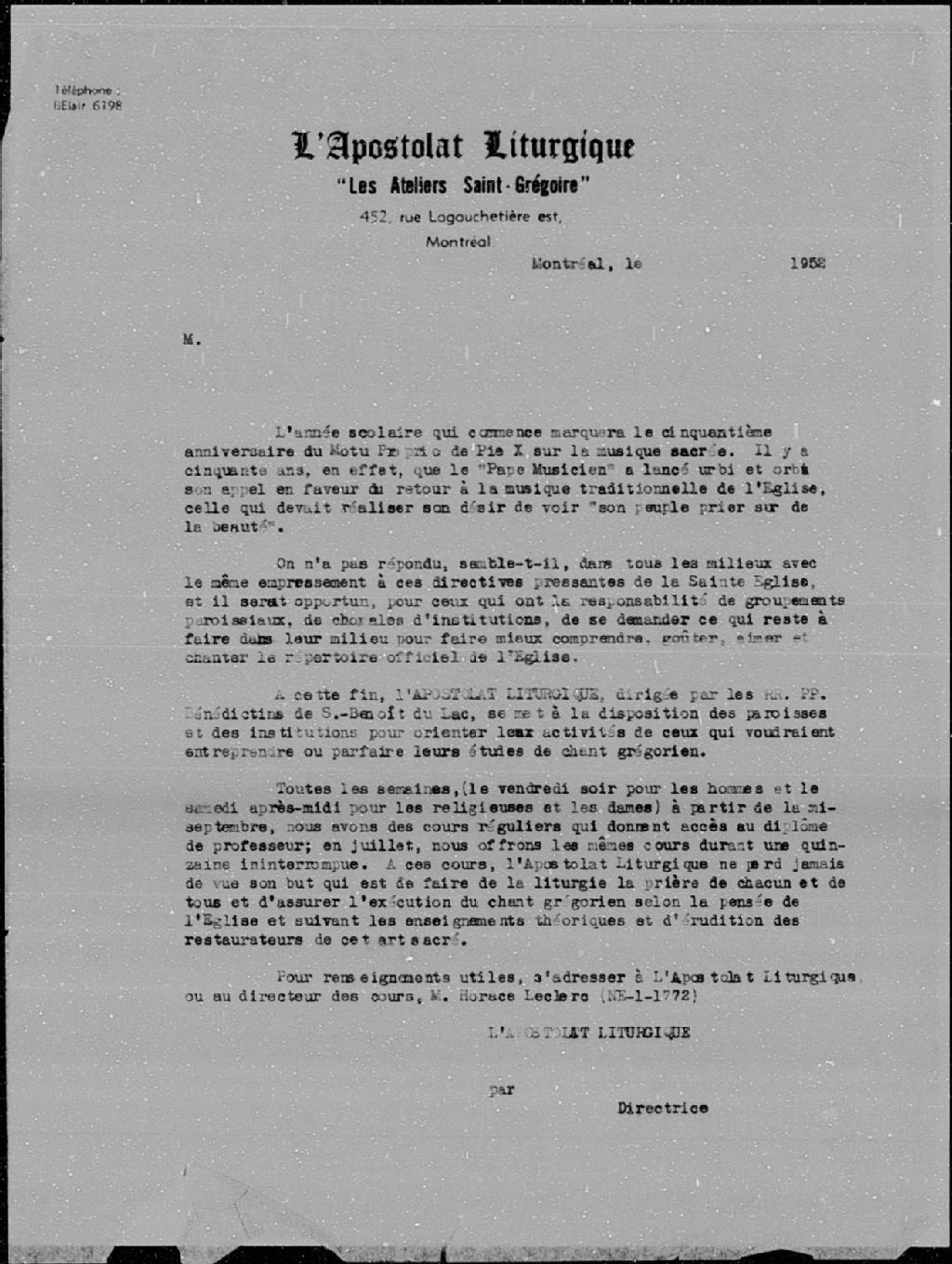 Circulaire de la directrice de l'atelier Saint-Grégoire informant les intéressés au sujet du cours de chant grégorien, 1952