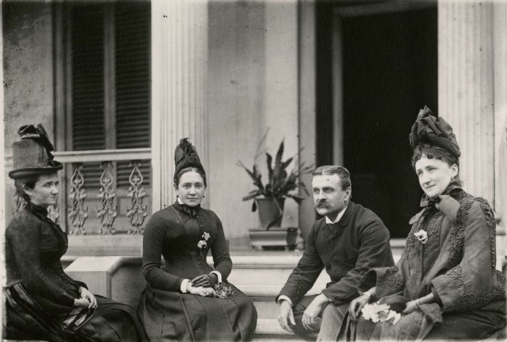 Philippe Landry et son épouse, Wilhelmine Couture (extrême gauche), en compagnie de deux femmes non identifiées sur la galerie de la villa Mastaï à Beauport