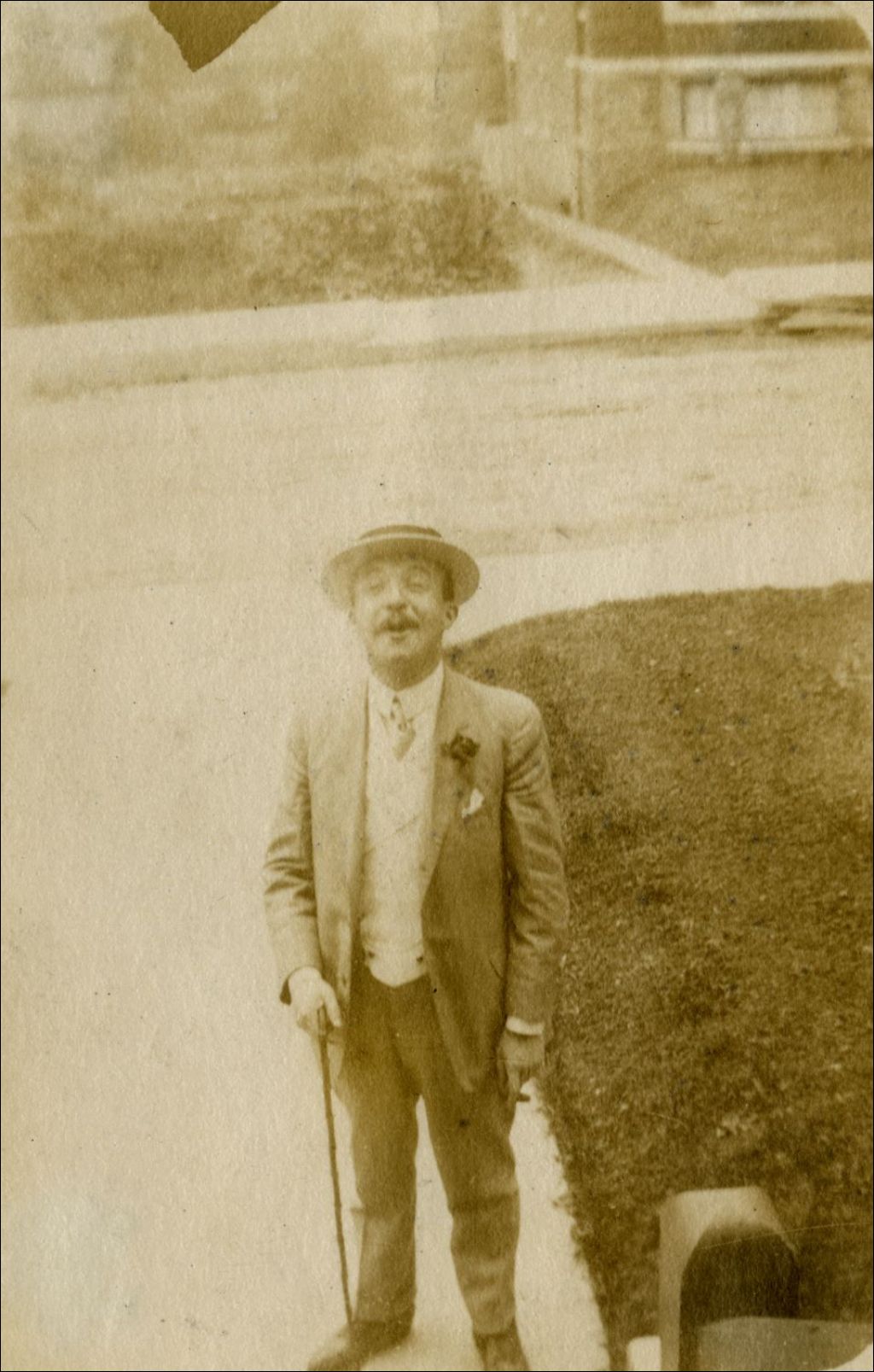 Un homme, peut-être Paul Lacoste, à l'entrée d'une résidence
