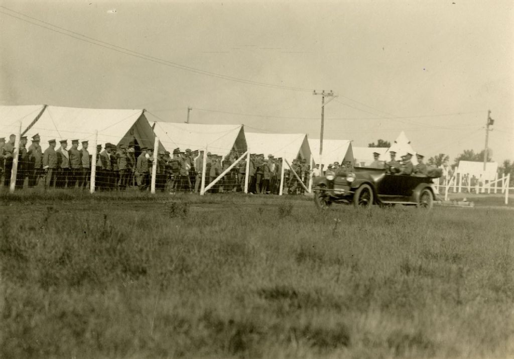 Officiers en voiture, dont le brigadier général Joseph Philippe Landry (siège arrière, à droite), arrivant dans un camp militaire, [Vers 1920], Archives nationales à Montréal, Fonds Famille Landry, (06M,P155,S1,SS1,D479), Photographe non identifié.