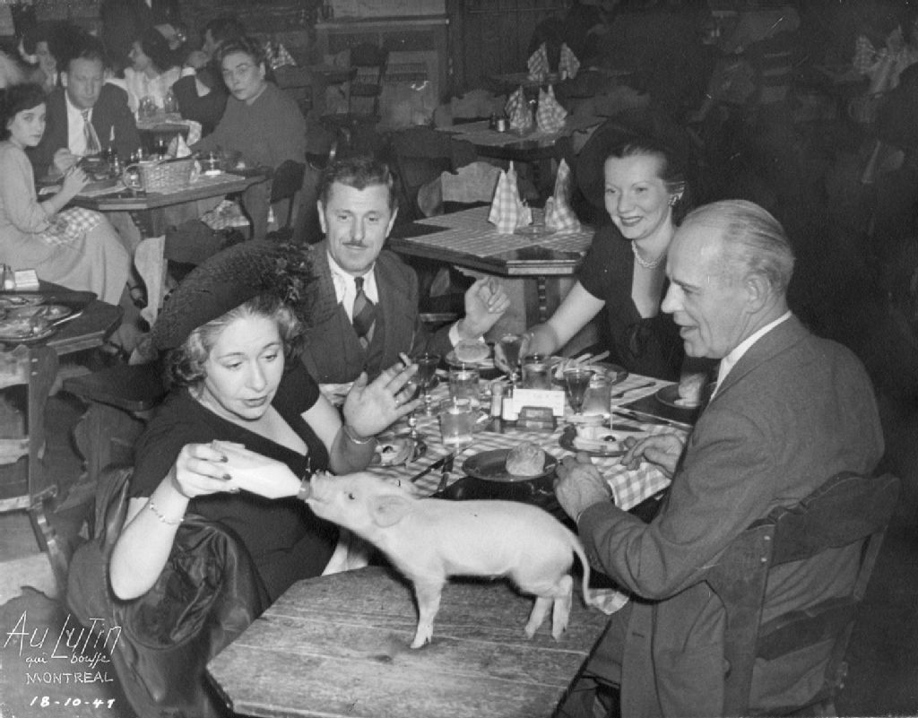 Ce dossier montre un groupe de personnes non identifiées assises à une table du restaurant. Une dame donne le biberon à un porcelet