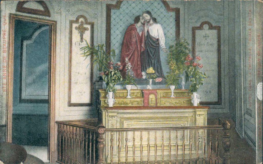 Autel dans la chapelle Scala Santa (trahison de Judas), Sainte-Anne-de-Beaupré, [Vers 1910], Archives nationales à Montréal, Fonds Laurette Cotnoir-Capponi, (06M,P186,S9,P324), Cotnoir-Capponi, Laurette.
