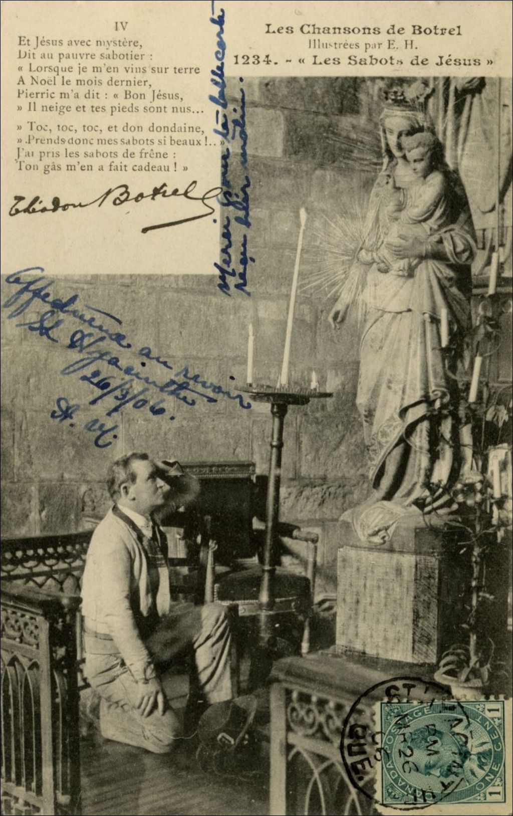 - Cette carte illustre un couplet d'une chanson du chansonnier français Théodore Botrel (1868-1925). La carte postale datée du 26 mars 1906 est adressée à M.-Eugénie Paré de la part de Albina