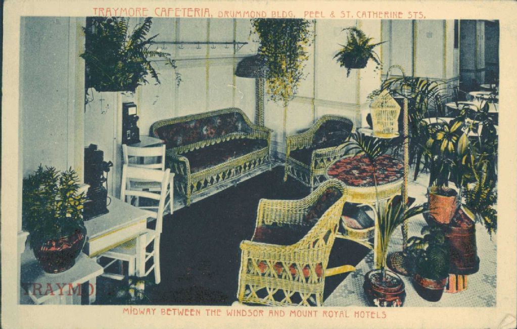 Traymore Cafeteria, Drummond Bldg, Peel & St. Catherine. Midway Between the Windsor and Mount Royal Hotels, [Vers 1920], Archives nationales à Montréal, Fonds Laurette Cotnoir-Capponi, (06M,P186,S9,P97), Cotnoir-Capponi, Laurette.