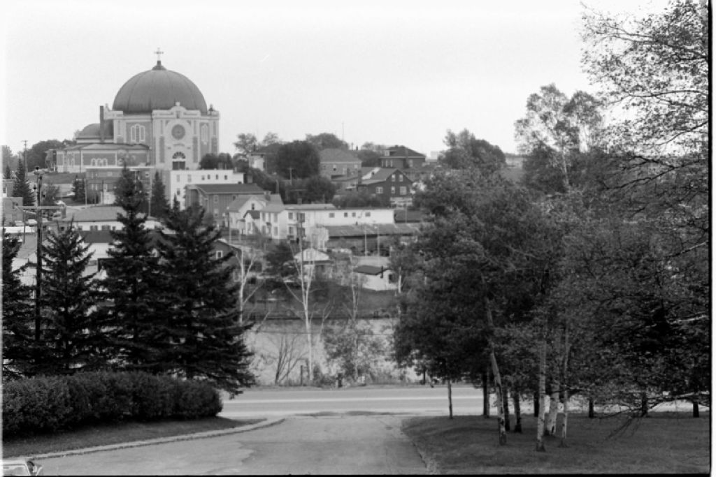 Vues d'Amos ; cathédrale, évêché, institution religieuse, palais de justice, hôpital, centre ville, parc, rivière Harricana et ferme