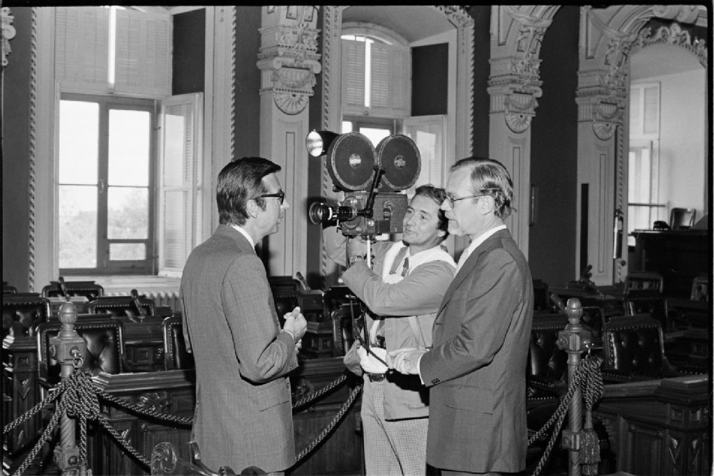 Signature de documents à l'Assemblée nationale par Robert Bourassa, Gérard D. Lévesque, Jacques-Yvan Morin, Jean-Marie Lavoie et Lise Patenaude, 1976-09-03, Archives nationales à Québec, Fonds Ministère des Communications, (03Q,E10,S44,SS1,D76-468), Raymond Duguay.