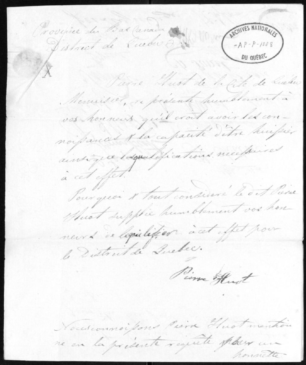 - Requête de nomination au poste de huissier de Pierre Huot pour le district de Québec