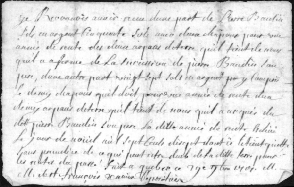 - Ce dossier est composé d'un reçu accordé à Pierre Baudin par Mère M. St-François-Xavier, pour avoir payé ses rentes le 29 novembre 1701
