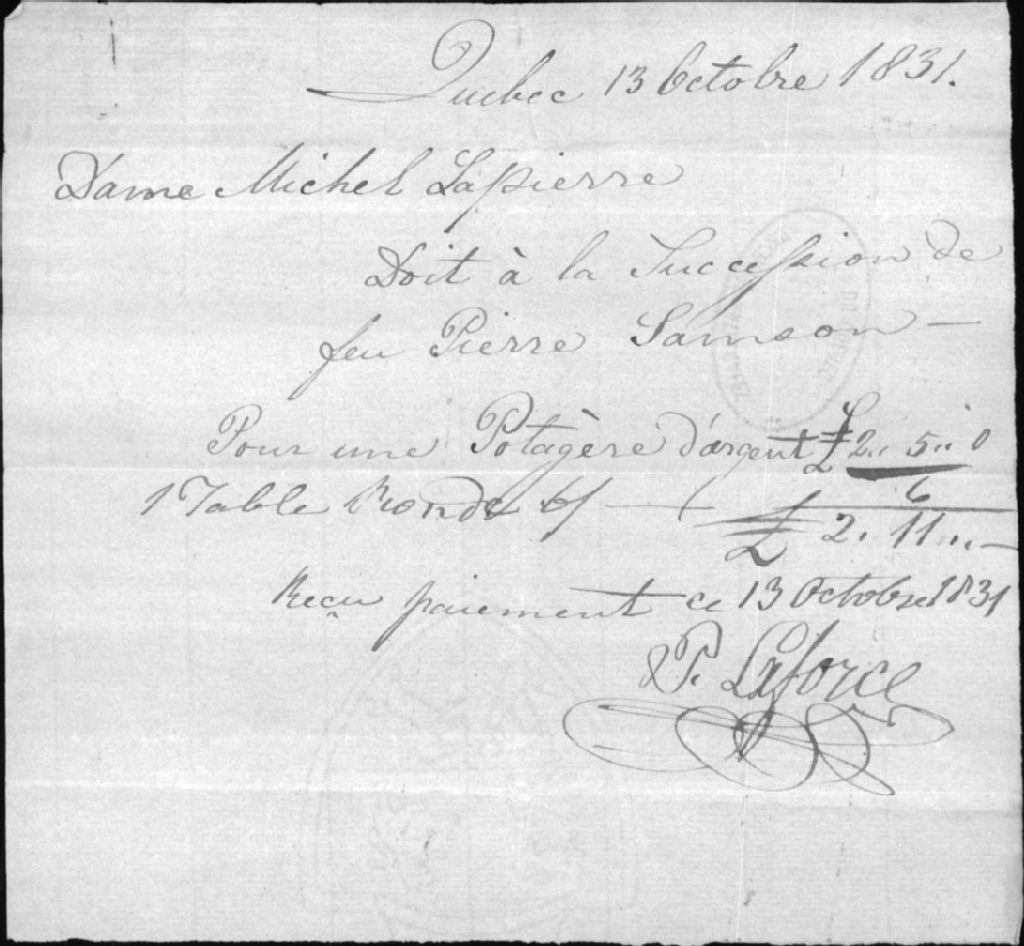 - Ce dossier est constitué d'un reçu à Mme Lapierre signé Jacques Voyer: paiement d'une écuelle d'argent, et d'un reçu à Mme Lapierre signé P. Laforce en paiement d'un compte à la succession Pierre Samson, en original et copie dactylographiée