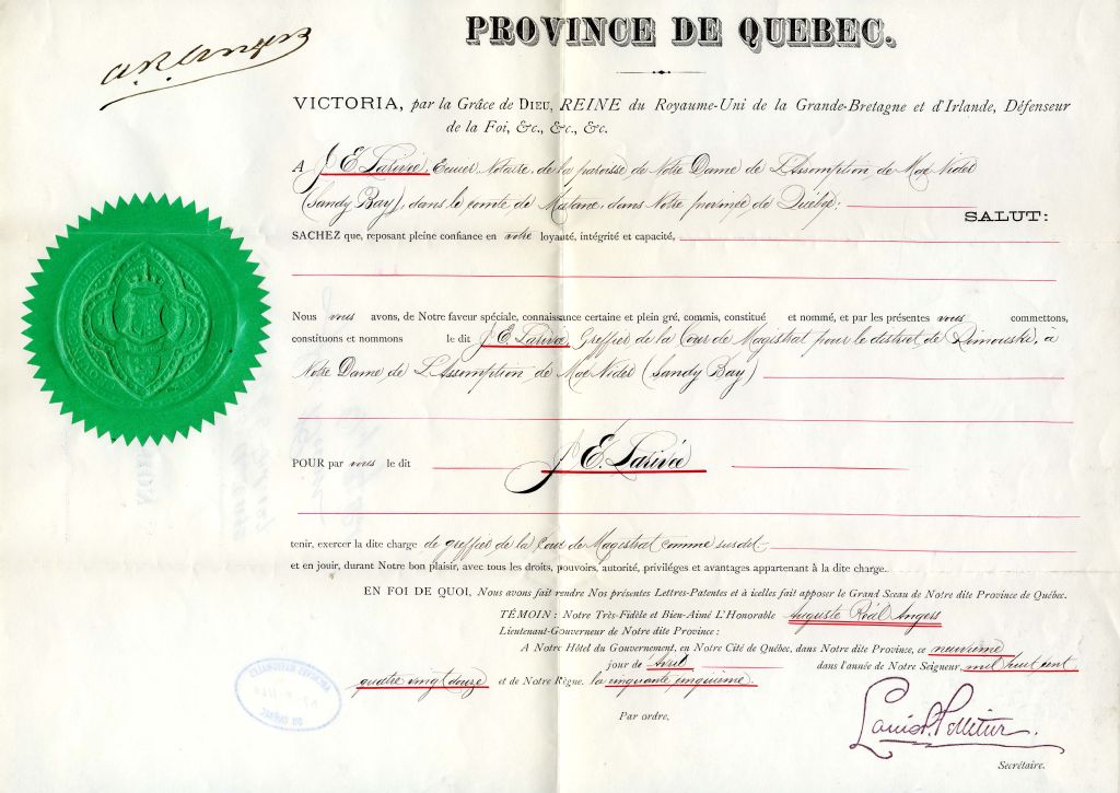 - Ce dossier est constitué d'une commission de greffier de la Cour du Magistrat, district de Rimouski