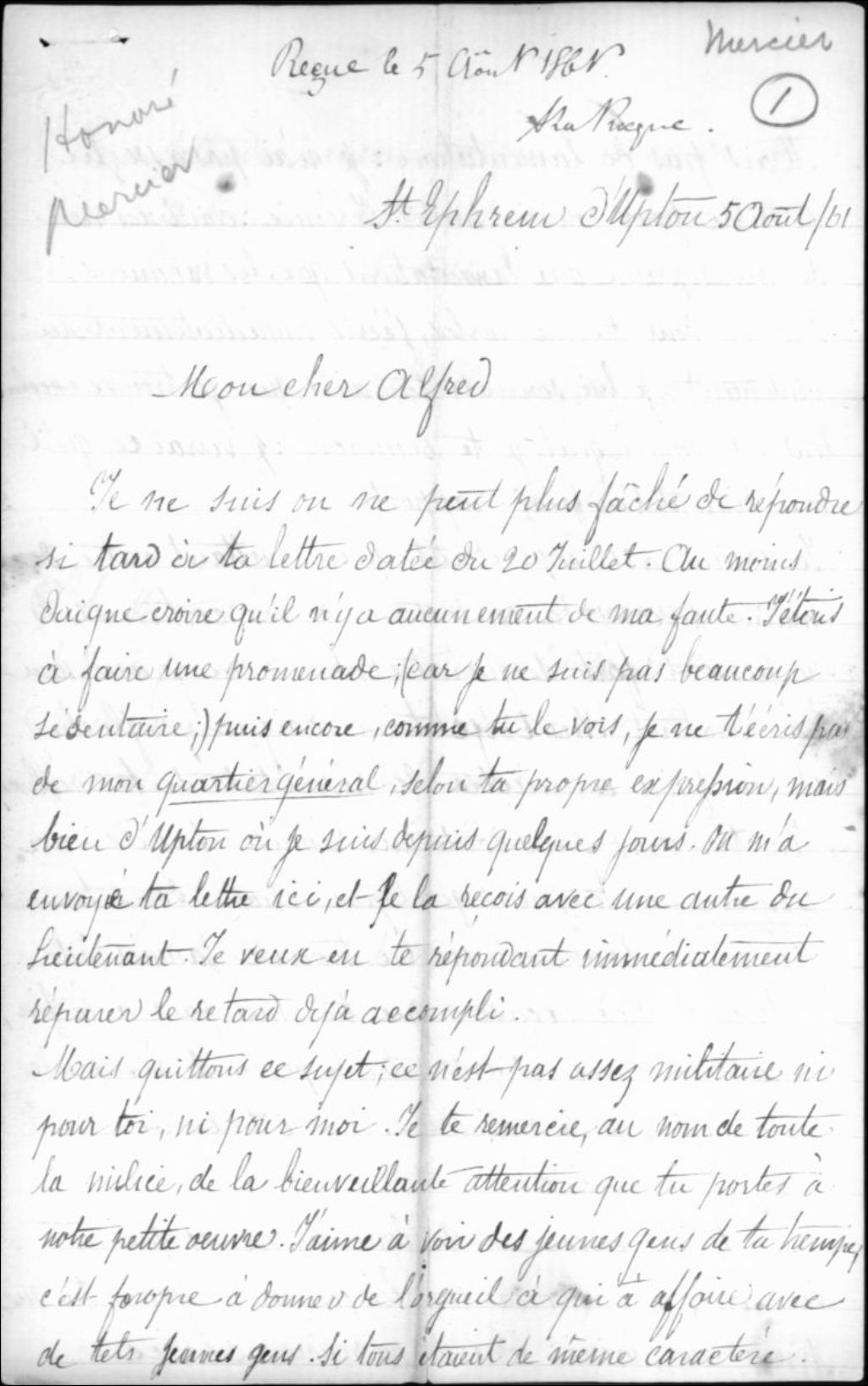 - Ce dossier est constitué des documents suivants: deux lettres d'Honoré Mercier à Antoine Larocque portant sur ses ambitions pour la milice, s.l., 1861, avec aussi une note exposant des conseils pour un milicien; une lettre d'Alfred Larocque à P.-G. Roy, pour lui confier ces lettres, 4 février 1927; un index de familles canadiennes; quelques notes et biographies sur les ancêtres de la famille Larocque, 113 pages en copies dactylographiées et coupures de presses