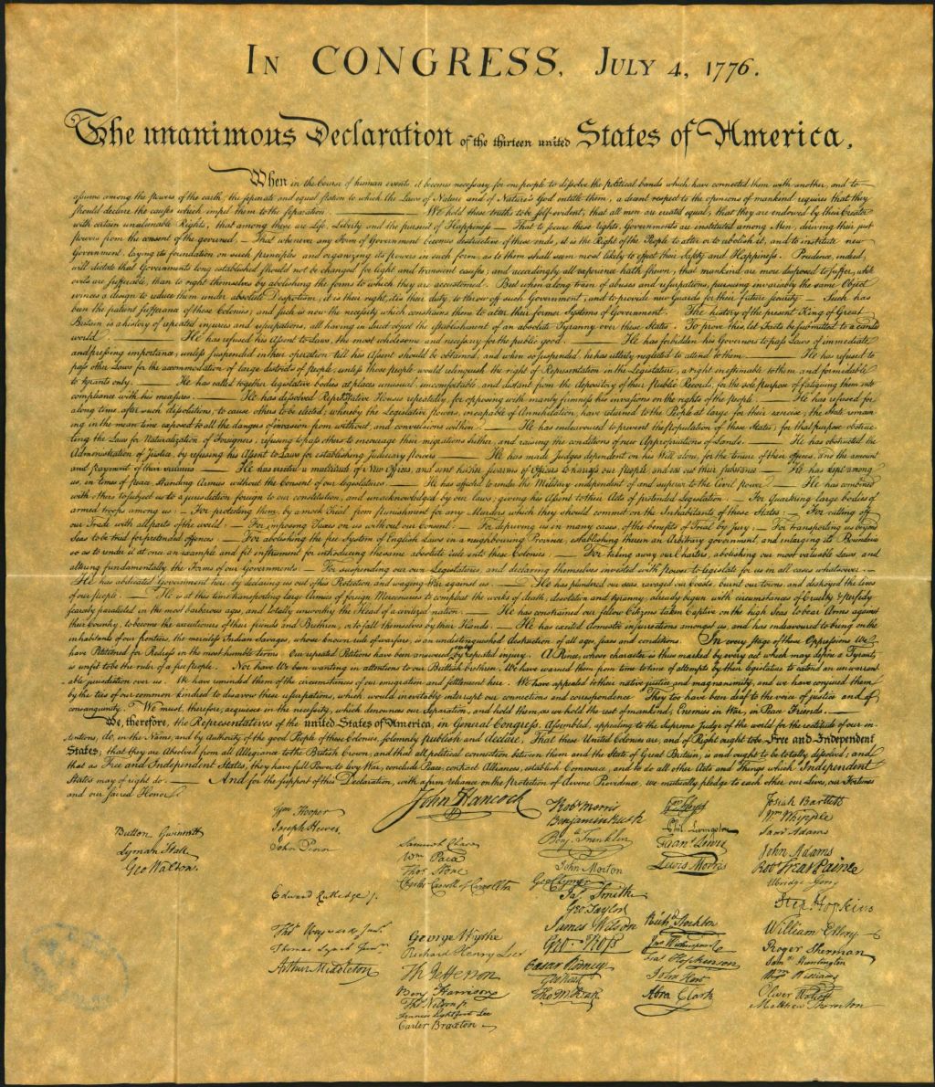 Déclaration d'indépendance des Etats-Unis sur fac-similé avec signatures, 4 juillet 1776, Archives nationales à Québec, Collection Centre d'archives de Québec, (03Q,P1000,S3,D1249).