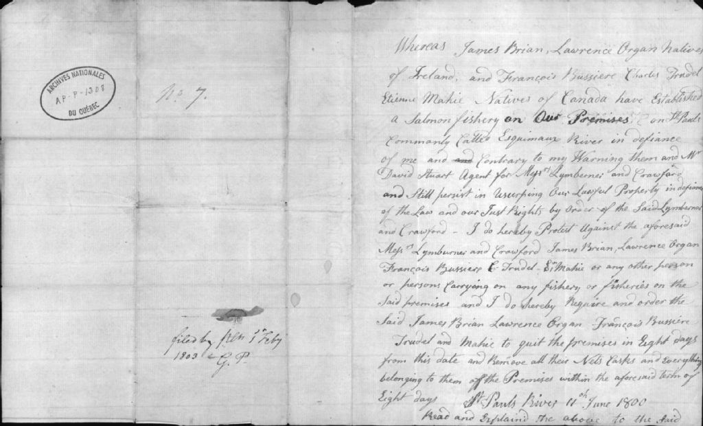 Protestation de Nath. Lloyd contre M. Lymburner pour ses droits de pêche à la rivière des Esquimaux