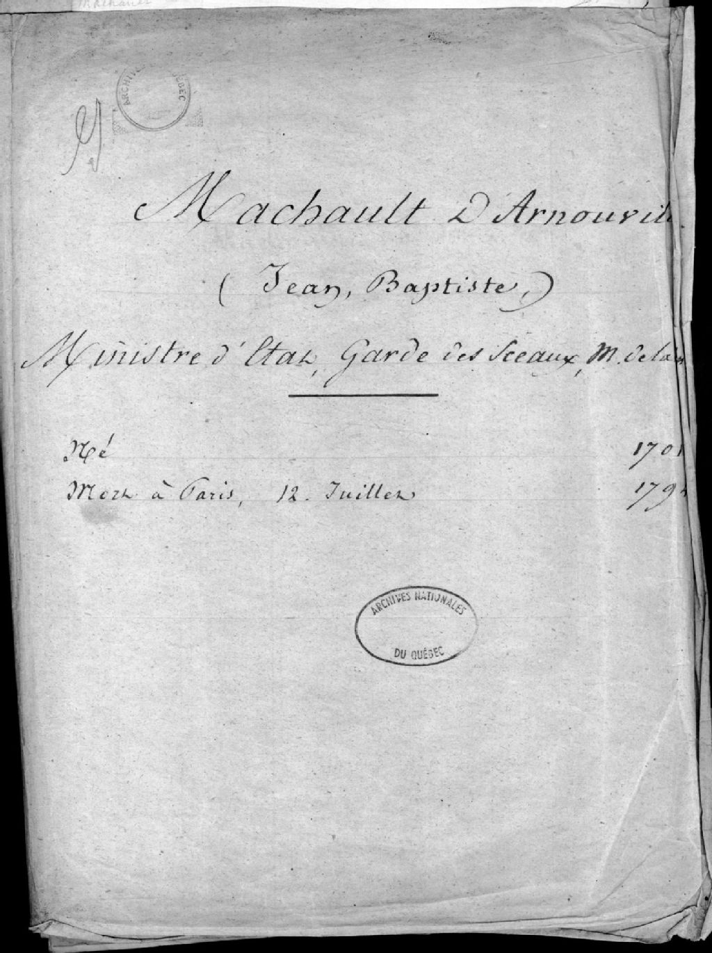 - Ce dossier est constitué entre autres de dix-huit lettres de J.-B. de Machault à divers correspondants et une adjudication approuvée par lui, 1751-1785; de trois lettres d'Armand-Hilaire de Machault et trois quittances, 1819-1820; de neuf lettres du comte Charles-Henri-Louis de Machault, un reçu, un serment et une notice biographique imprimée, 1798-1827; de huit lettres et actes notariés de divers membres de la famille Machault, 1707-1776; de Dix-neuf quittances, 1600-1700