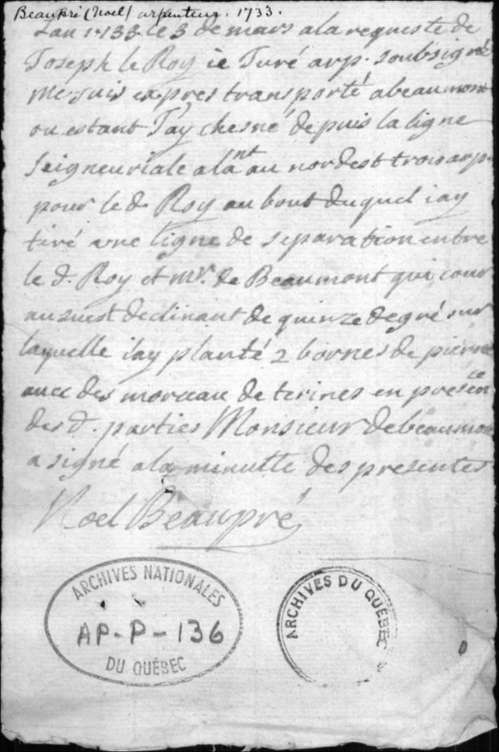 - Ce dossier est composé de la copie manuscrite des minutes d'arpentage du tracé de la ligne de séparation entre la terre de Joseph LeRoy (Roy) et du sieur de Beaumont à Beaumont en 1733, par Noël Beaupré (1684-1755)