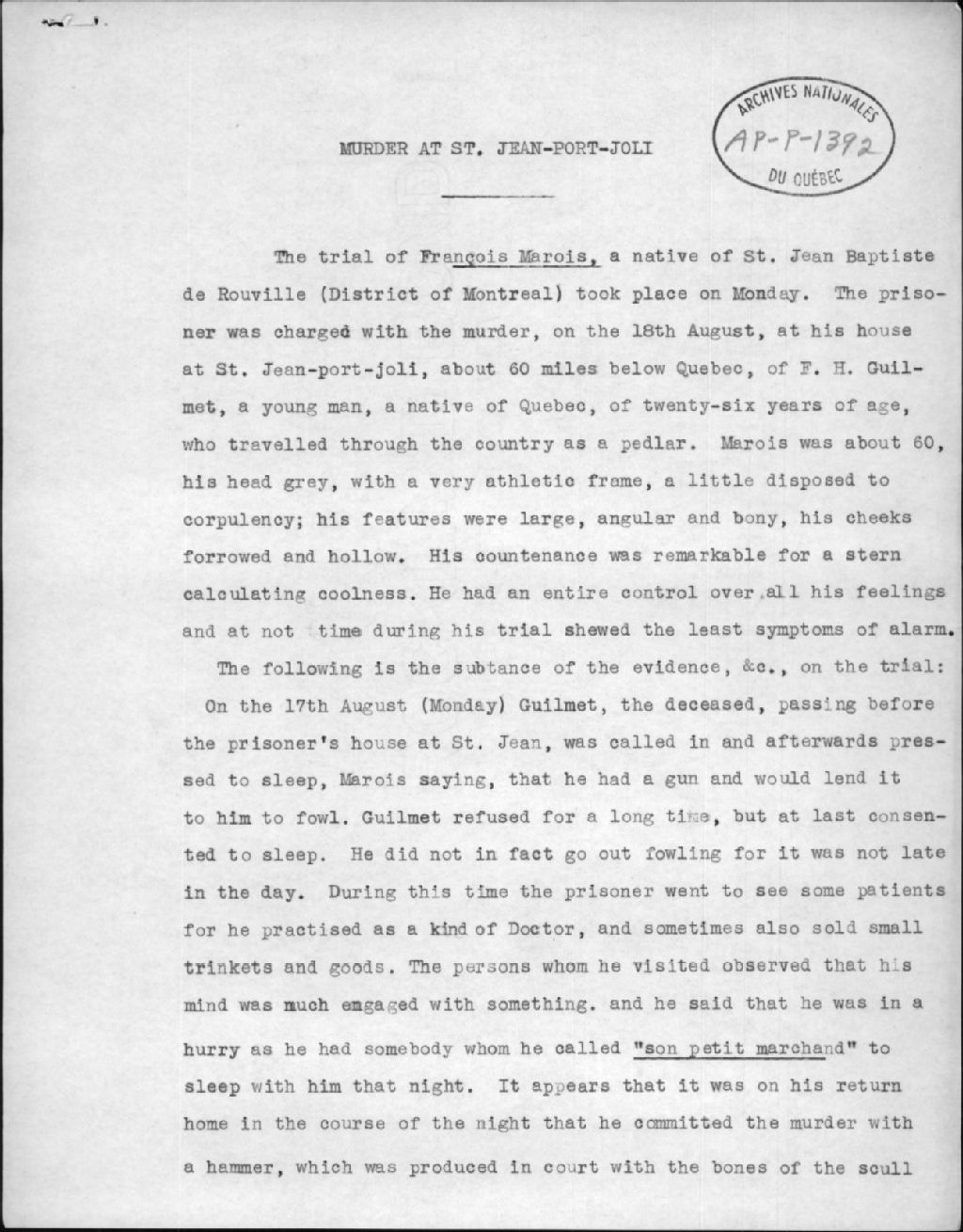 - Ce dossier contient des documents relatifs au procès de François Marois (1769-1829), charlatan, pour le meurtre de F.-H. Guilmet, 1829: inculpation pour meurtre de la Cour du Banc du Roi, septembre 1829 (Grand format); deux articles de la Gazette de Québec dont un en français et un en anglais, 1829; billet contenant douze noms d'hommes, probablement les noms des jurés, signé par le sheriff (nom ?); document de 27 pages étant probablement le plaidoyer de la défense car il commence par: «Messieurs les jurés,...»; ordre d'exécution, 28 septembre 1829; requête du Dr J.-B. Grenier afin d'obtenir le corps pour dissection après la pendaison