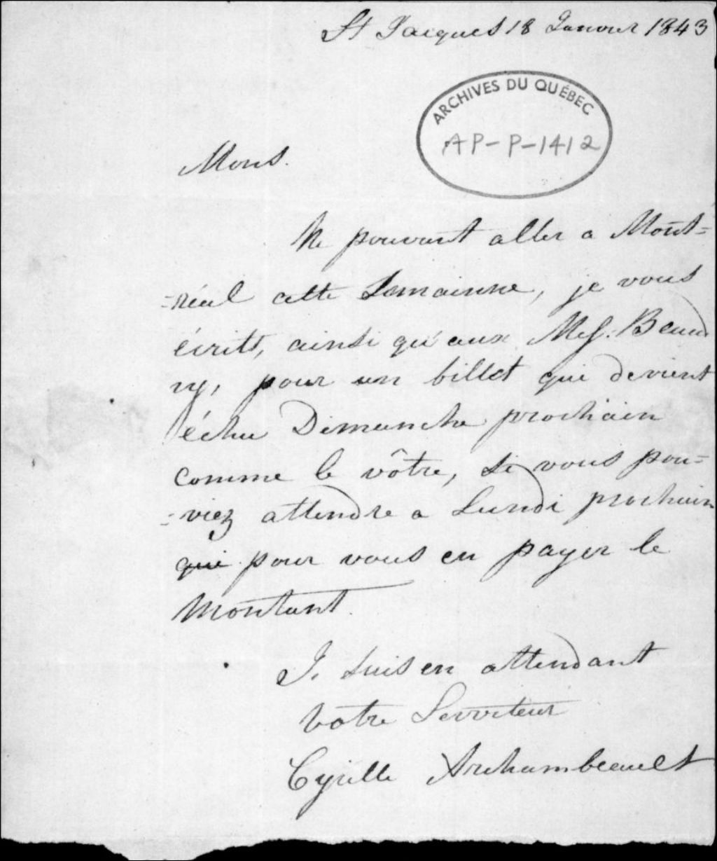 - Ce dossier contient un reçu d'abonnement à la Gazette Officielle de Québec donné à Jos. Masson par L. C. Gravel pour E. R. Fabre (agent de Thomas Carry), 1836. Lettre de Cyrille Archambeault, 1843. Lettre de W. C. Meredith, 1843. Lettre de J. B. Leblanc, 1843