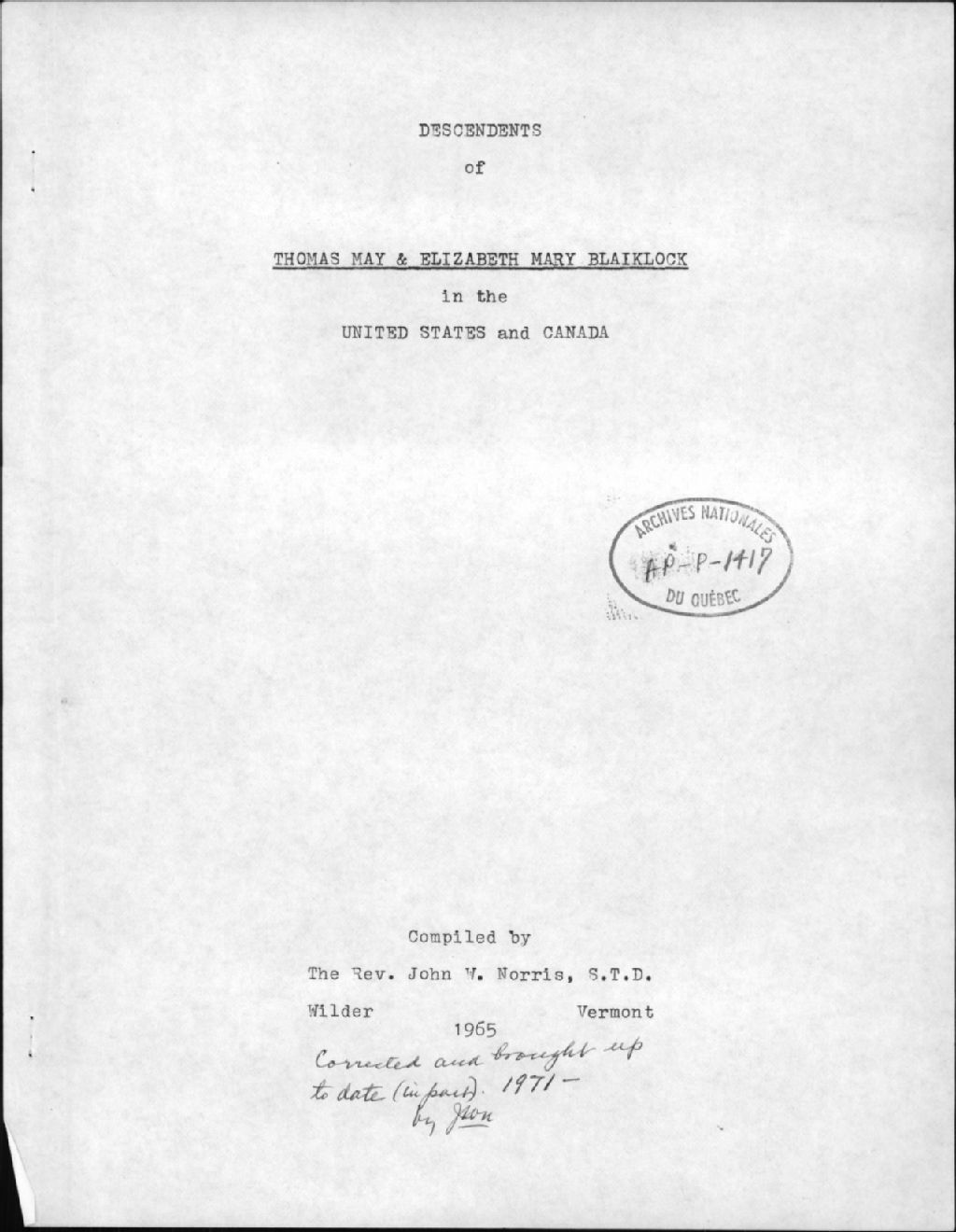 - Ce dossier contient la photocopie de la généalogie de Thomas May et Elizabeth Mary Blaiklock aux Etats-Unis et au Canada, avec annotations manuscrites, travail fait par John W. Norris