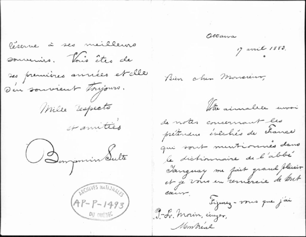 - Lettre de Benjamin Sulte à Pierre-Louis Morin