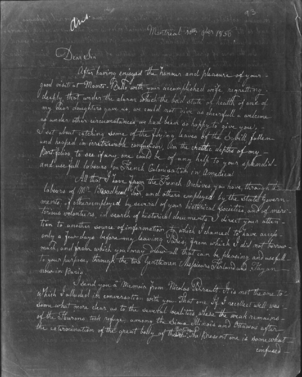 Lettre de Louis-Joseph Papineau concernant les archives du Régime français à Francis Parkman