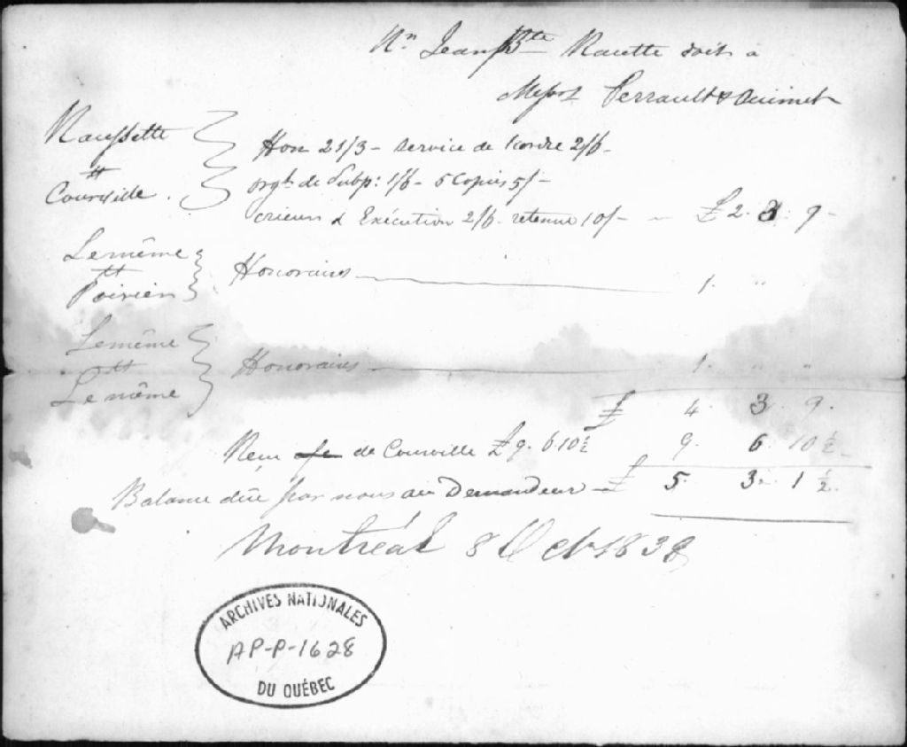 - Ce dossier contient un compte de Jean-Baptiste Racette envers Perrault & Ouimet pour des honoraires dus