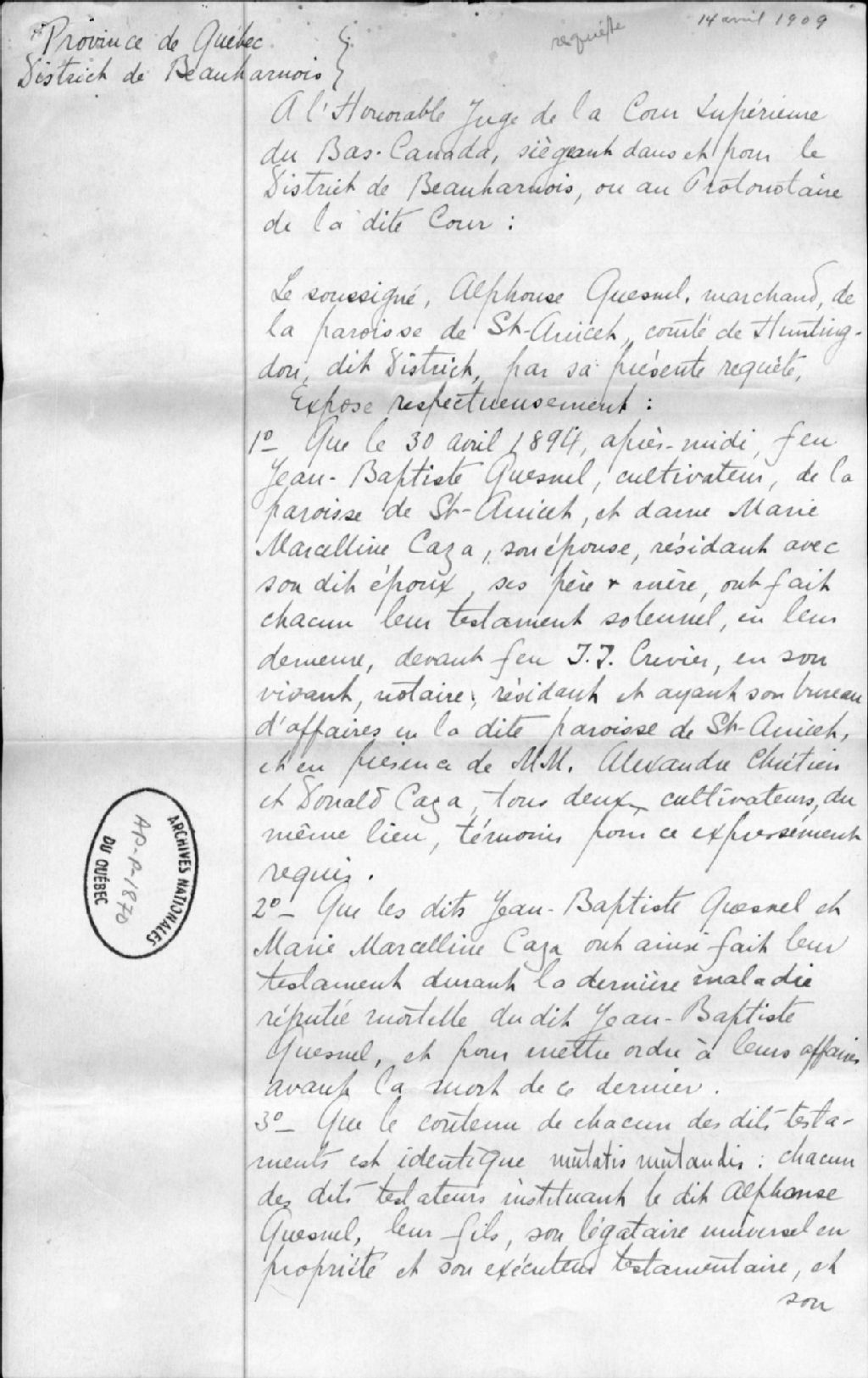 Requête de vérification de testaments de Alphonse Quesnel, 1905-1909, Archives nationales à Québec, Collection Centre d'archives de Québec, (03Q,P1000,S3,D1870).