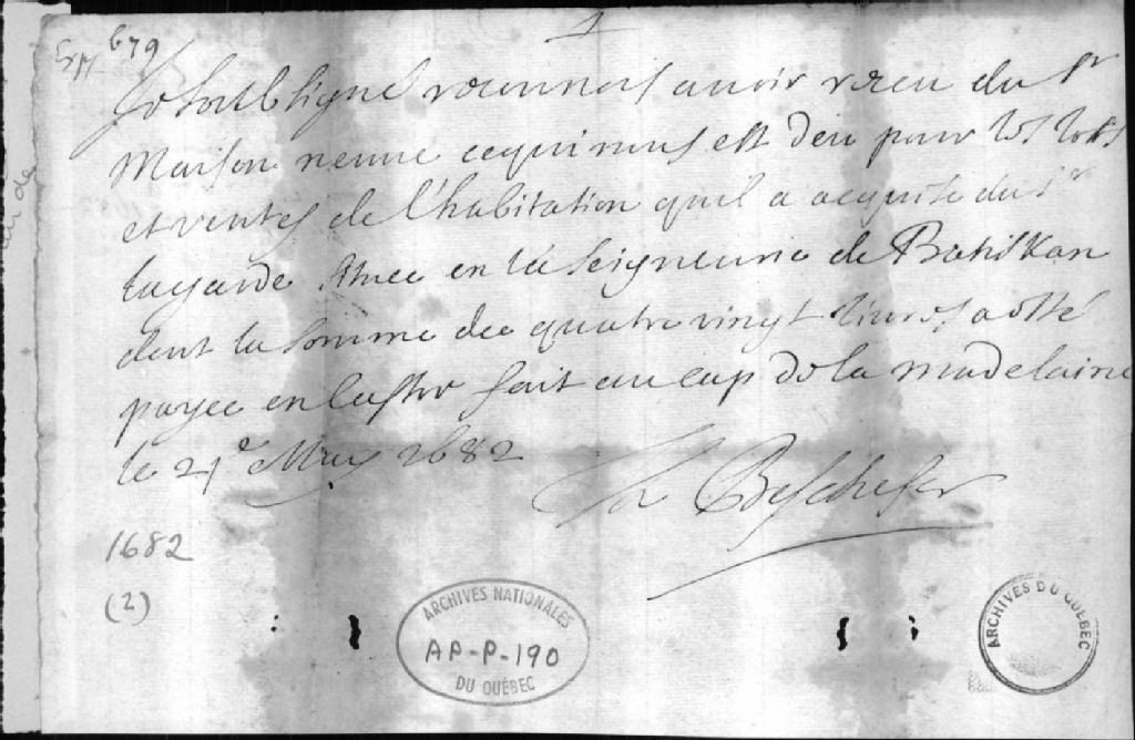 - Ce dossier est composé d'une quittance de P. Thierry Beschefer, s.j. (1630-1711), au sieur de Maisonneuve pour lots et ventes de l'habitation acquise du sieur Lagarde en la seigneurie de Batiscan