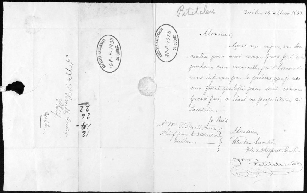 - Ce dossier est constitué de sept documents concernant l'engagement de Sewell comme shérif de Québec, d'une lettre de Ths Petitclerc informant Sewell qu'il n'est pas qualifié pour servir comme grand juré, d'une lettre de Georges Chaperon à William Smith Sewell (1798-1866) concernant son incapacité de servir de grand juré et certificat médical signé par le docteur R. Bédard, d'une lettre de Félix Têtu à William Smith Sewell concernant son incapacité de servir de grand juré, d'une lettre de William Sax introduisant Luc Simard à Sewell