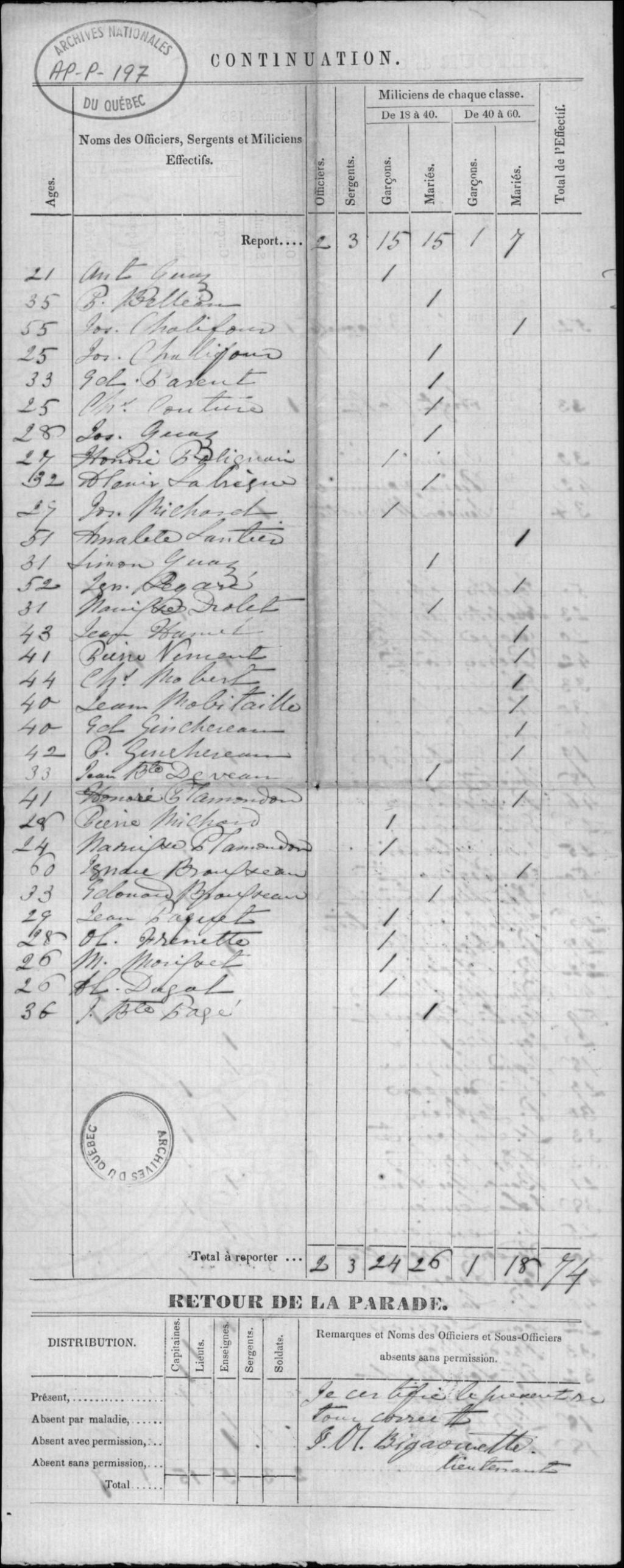 Liste des officiers et miliciens de la compagnie de J.-Octave Bigaouette, [Vers 1855], Archives nationales à Québec, Collection Centre d'archives de Québec, (03Q,P1000,S3,D197).