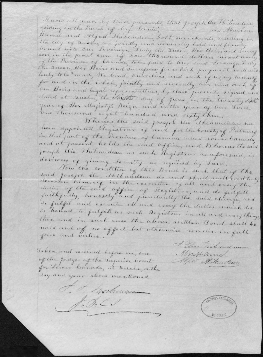 Nomination de Joseph-Élie Thibaudeau, 6 juin 1863, Archives nationales à Québec, Collection Centre d'archives de Québec, (03Q,P1000,S3,D1998).