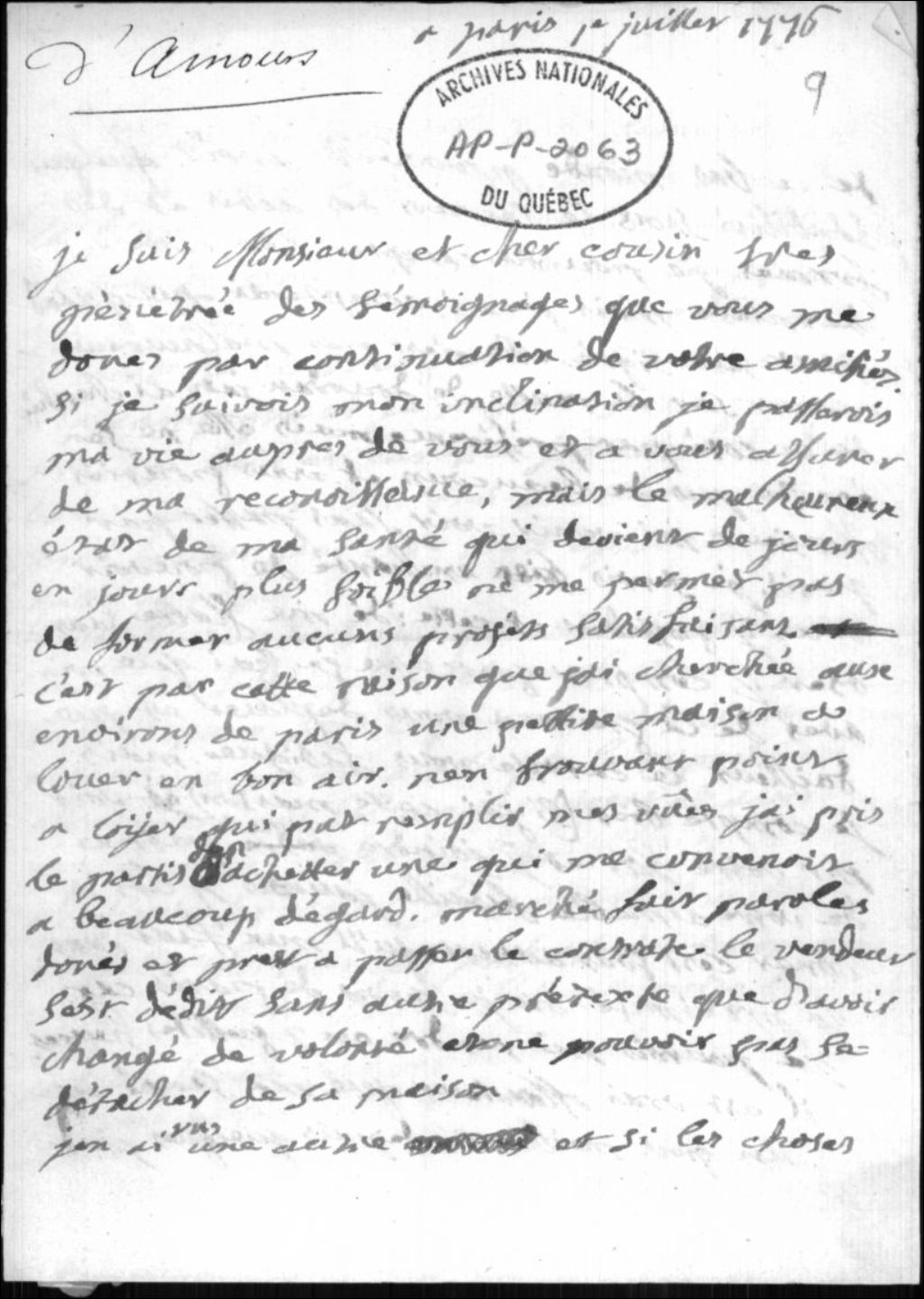 Lettres concernant le Comte de Verseillac et Mme D'Amours de St-Gilles