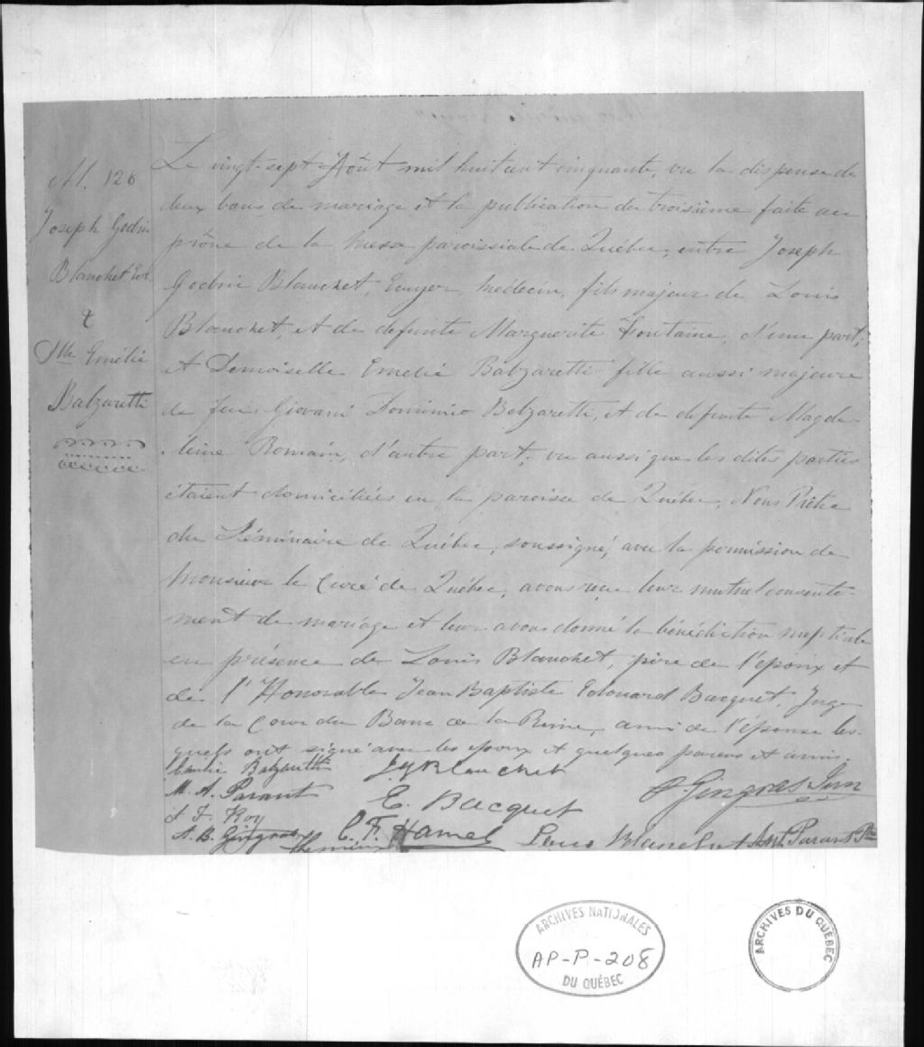 Ce dossier est composé du photostat d'un certificat de mariage de Joseph-Goderic Blanchet, médecin de Québec, président des Communes, avec Emélie Balzaretti. Paroisse Notre-Dame de Québec