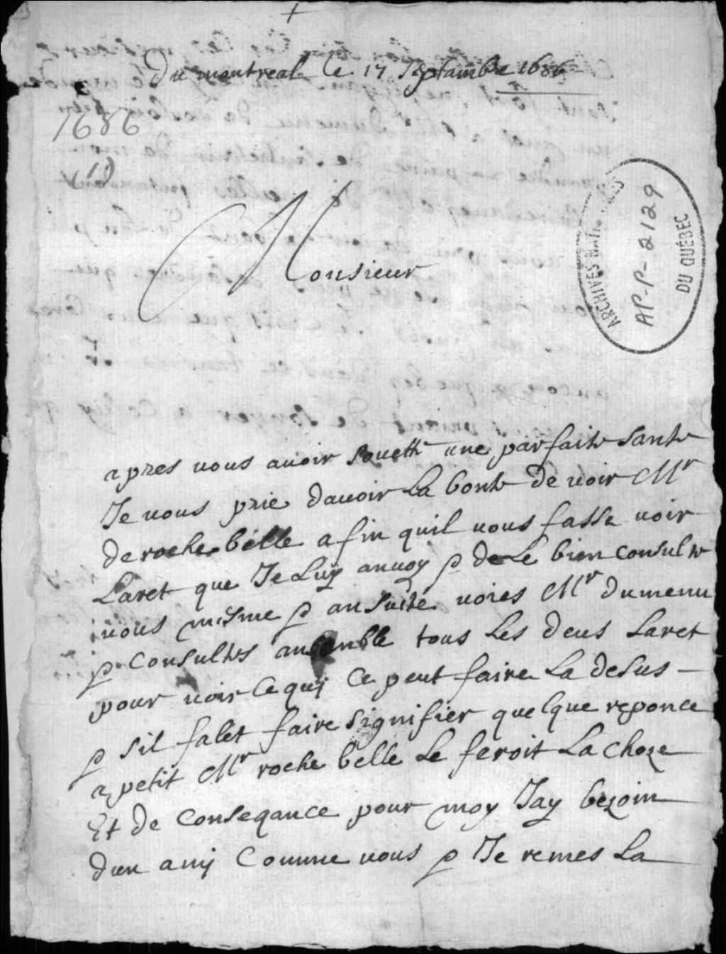 - Ce dossier contient deux comptes sur un même document: l'un entre Babie et René Blanchet, l'autre entre le sieur LaRue et Babie (1678/9). Contient également une lettre de Babie à un destinataire inconnu (1686) ; il est question du sieur DeMesnu qui doit discuter de l'affaire de Babie avec l'intendant De Meulles, etc