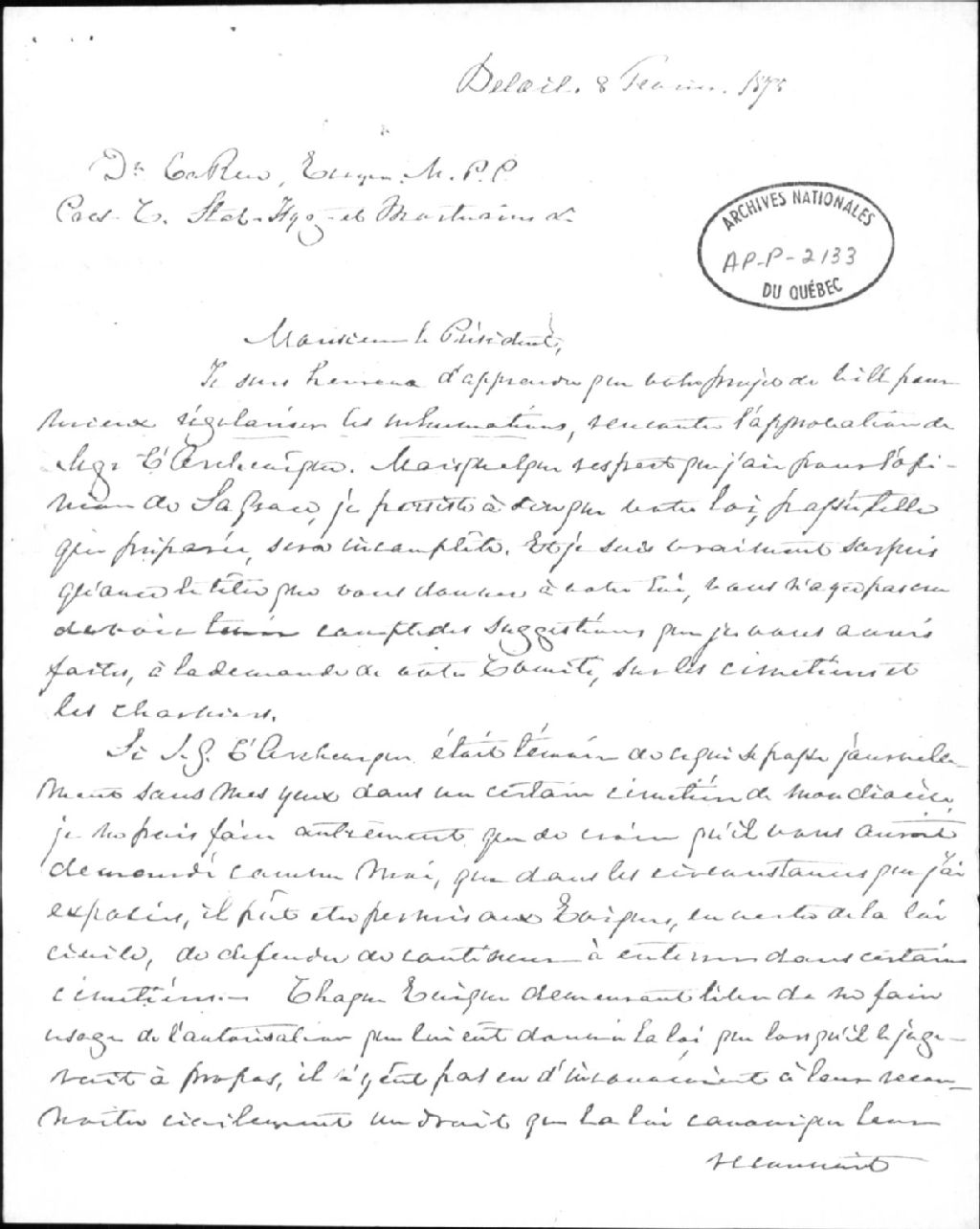 - Ce dossier contient une photocopie d'une lettre de Mgr Charles La Rocque concernant le bill proposé par Larue "Pour mieux régulariser les inhumations"