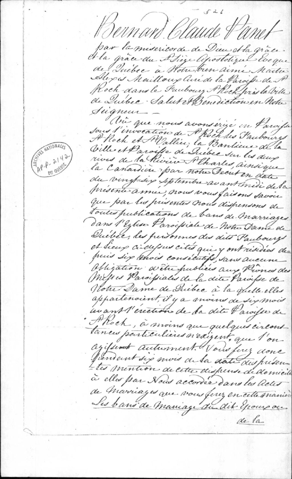 Document officiel de l'évêque de Québec Bernard-Claude Panet concernant la publication de bans de mariages pour la nouvelle paroisse de St-Roch de Québec; copie xérox