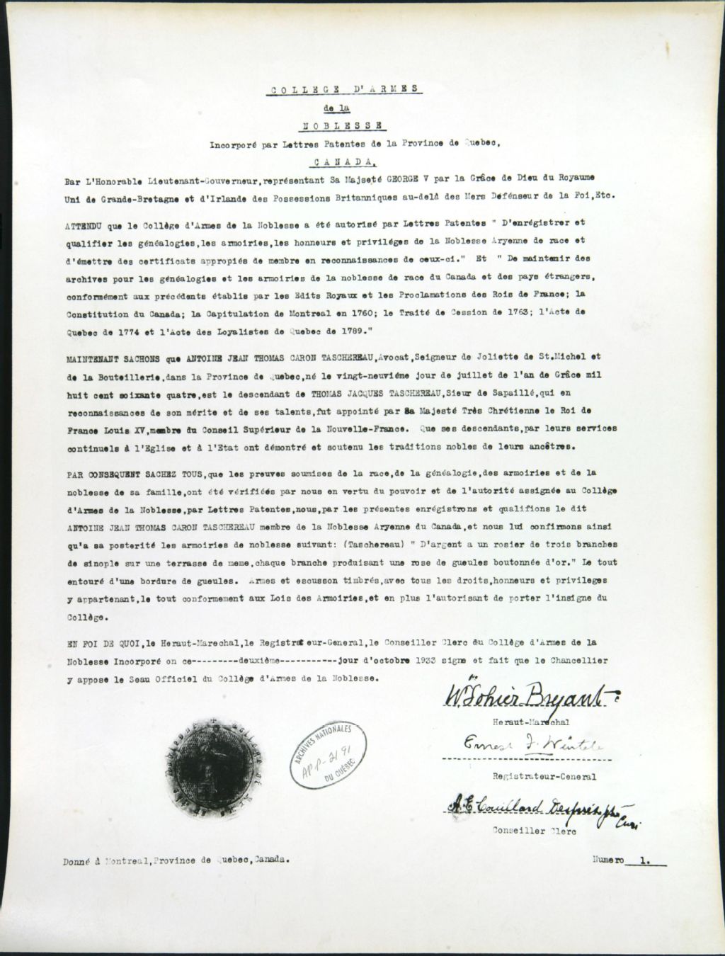 Lettres de noblesse Antoine-Jean-Thomas Caron Taschereau, 2 octobre 1933, Archives nationales à Québec, Collection Centre d'archives de Québec, (03Q,P1000,S3,D2191).