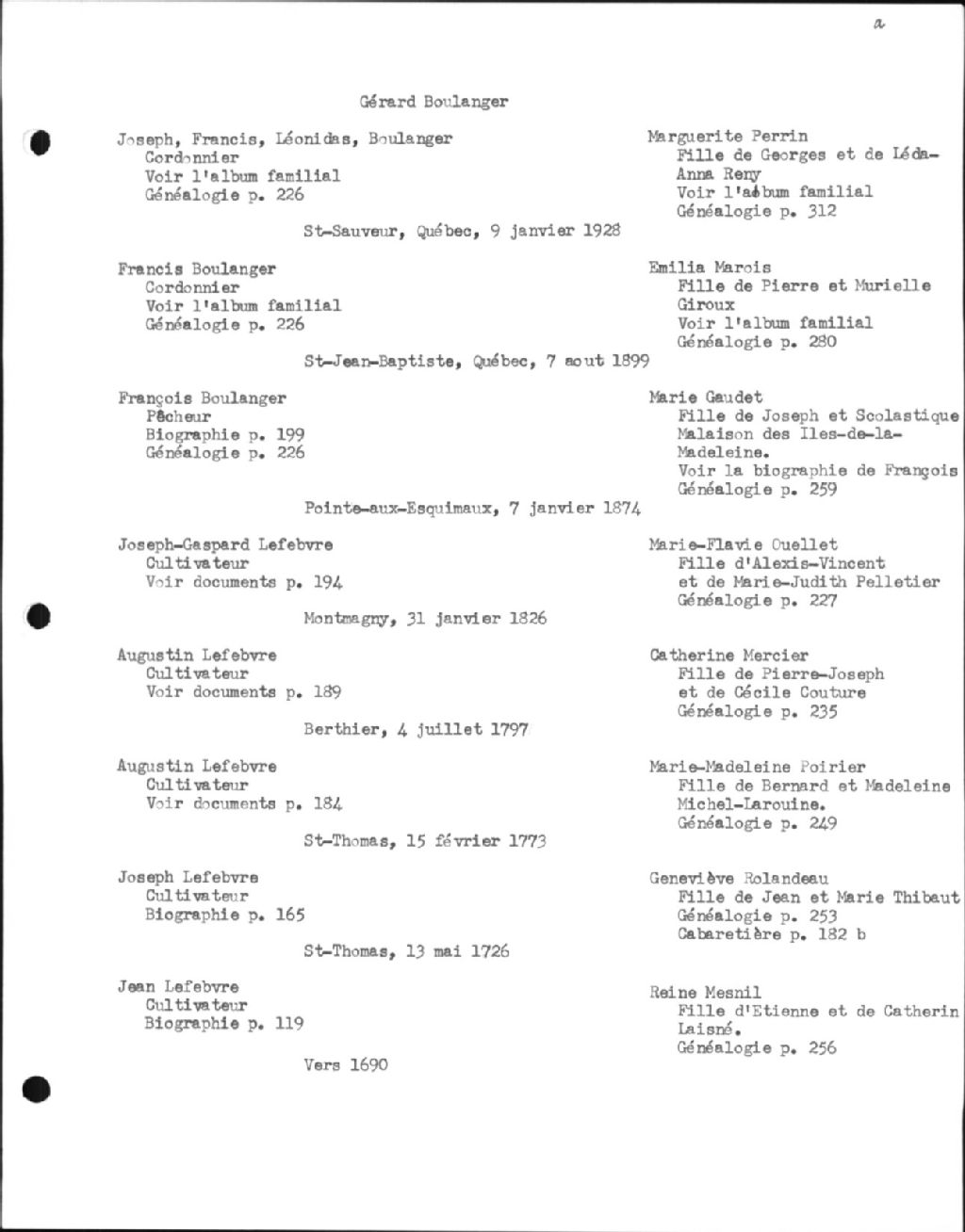 Documents généalogiques concernant la famille Lefebvre dit Boulanger, Après 1971-vers 1971, Archives nationales à Québec, Collection Centre d'archives de Québec, (03Q,P1000,S3,D2477).