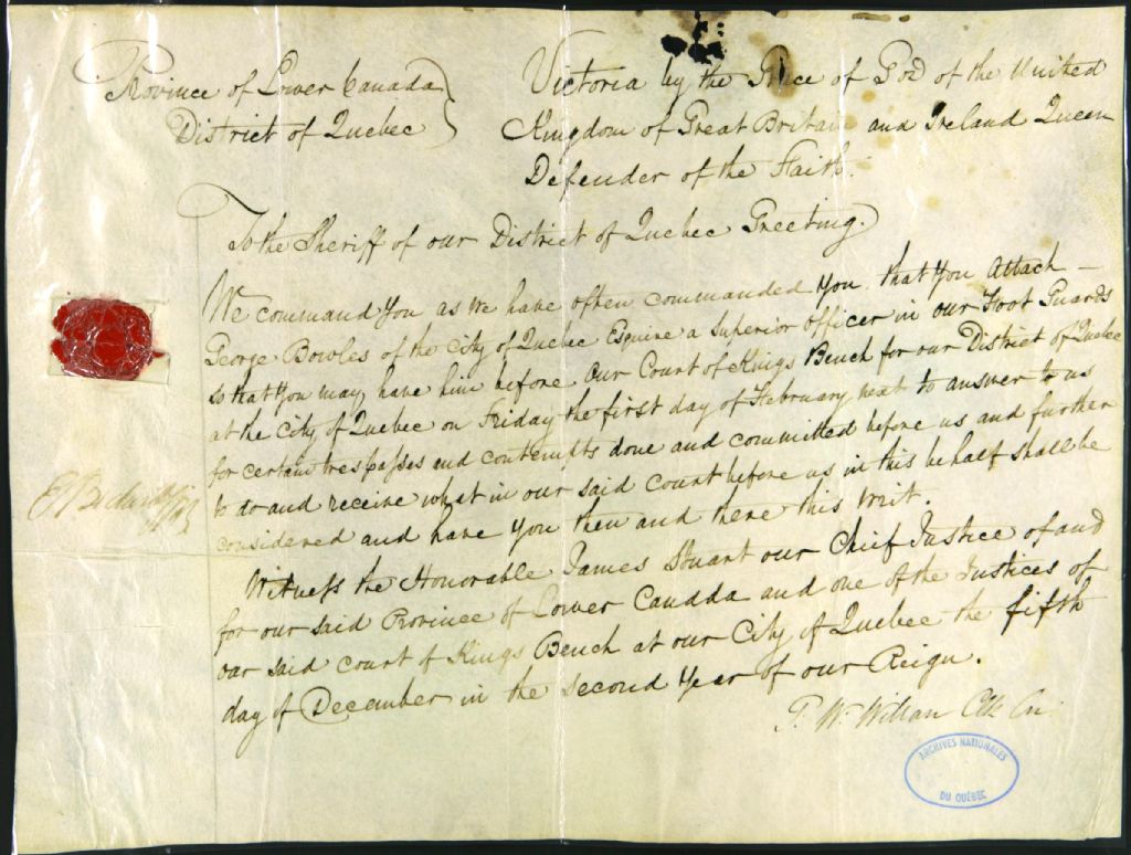 - Ce dossier est composé d'un bref adressé au shérif de Québec par T. W. Willan afin de faire comparaître l'officier Georges Bowles à la cour du Banc du roi